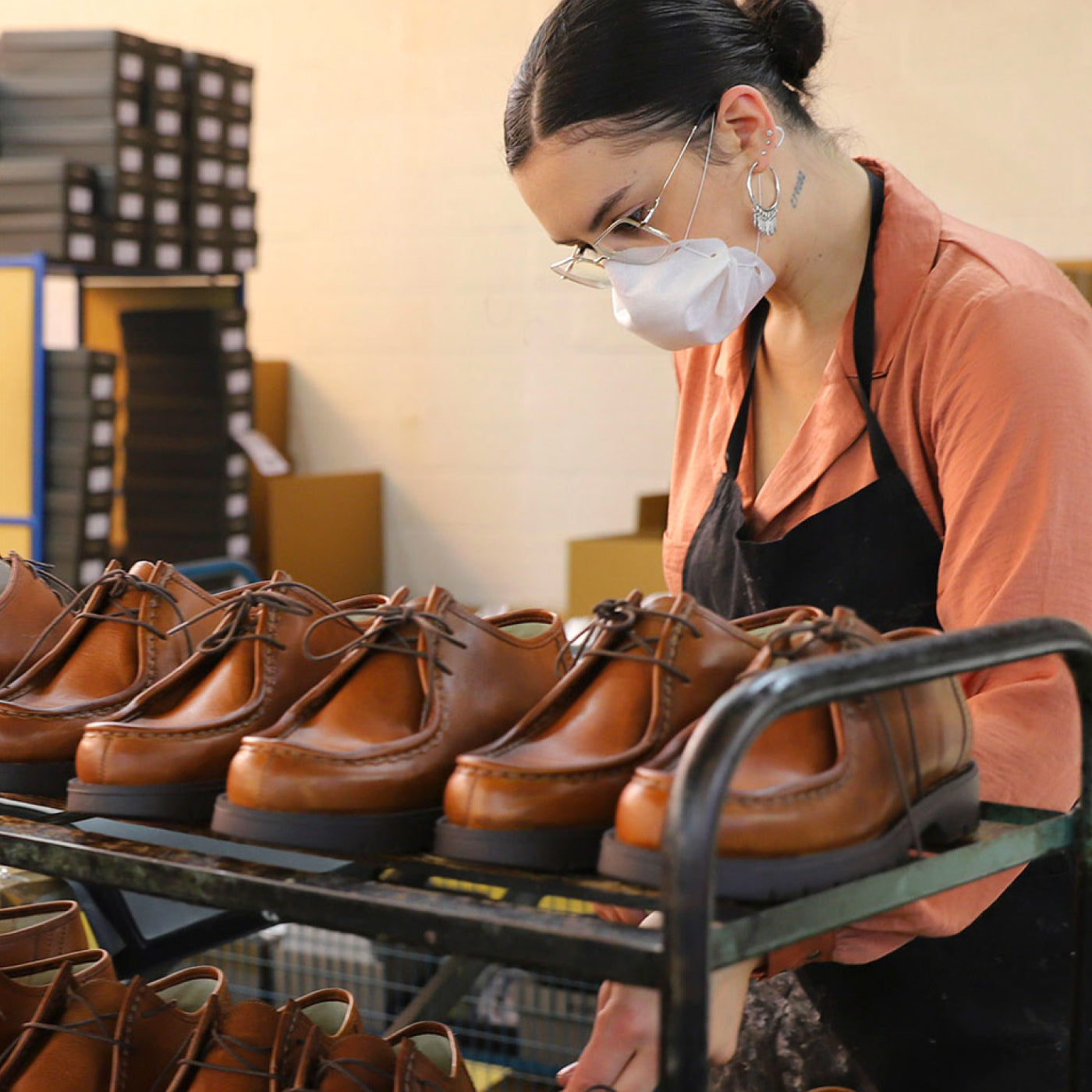 CLEONではラ・ロマーニュにある工房で45人近くを雇用しています。革をチェックし、裁断し、縫い、アッパーの様々なパーツをラストの上に組み立て、ソールに溶接し、ブラッシング、ワックスがけ、紐通し、箱詰めといった最終段階まで行います。
